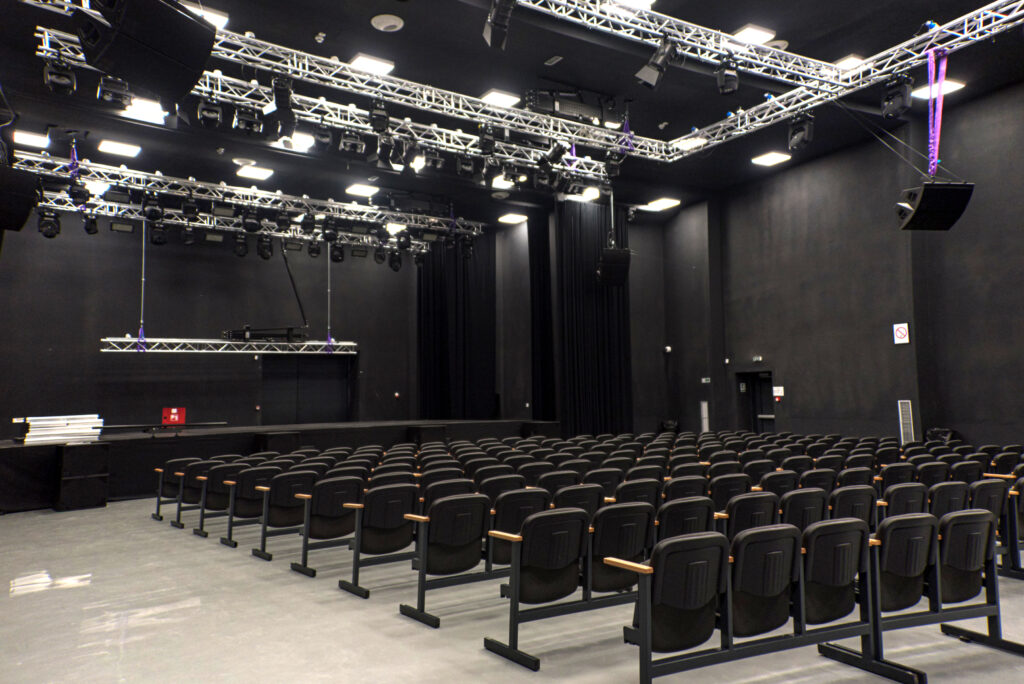 The venue is a multifunctional space on the ground floor of the main building, with an area of 410 m2, which contains a stage of variable dimensions and an LED screen with a maximum size of 18 m2. The space is intended for performing arts, concerts, performances, theater performances, and film screenings. The audience’s capacity is 200 seats, while the maximum number of standing seats is 500. Chairs are removable.