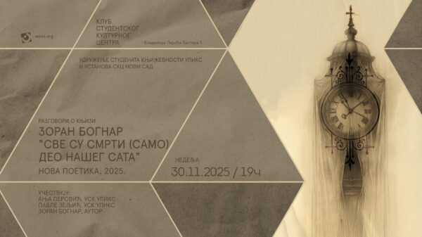 Промоција књиге Зорана Богнара „Све су смрти (само) део нашег сата“ одржаће се у недељу, 30. новембра у 19 часова, у Клубу СКЦНС-а, у Улици Владимира Перића Валтера 5.