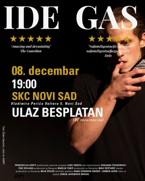 Новосадска премијера представе „Иде гас“ одржаће се 8. децембра у 19 часова у СКЦНС (Улица Владимира Перића Валтера 5). Представа је ауторски пројекат глумца Луке Грбића. Улаз је бесплатан уз